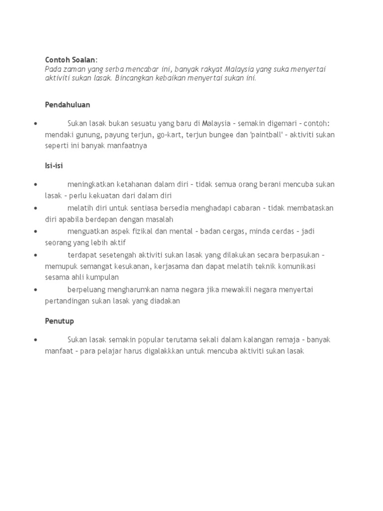 Contoh Karangan SPM Sukan Lasak. Contoh Karangan SPM Sukan Lasak SUKAN LASAK Remaja sekarang memang tahan lasak. 2 menguji kesabaran diri.